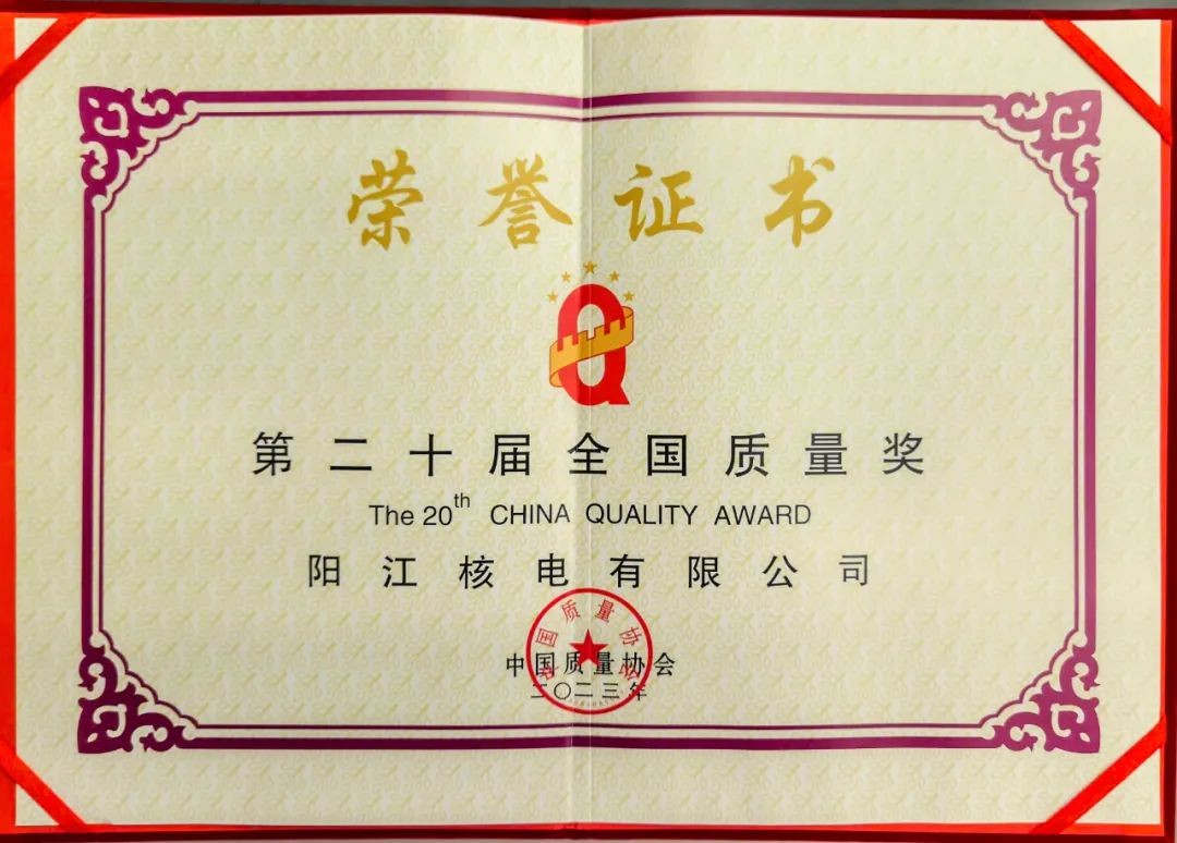12月1日,第二十届全国质量奖(2022-2023年)获奖名单公布。阳江核电有限公司以其卓越的经营绩效水平、显著的文化凝聚力和质量管理方面的突出表现,荣获第二十届全国质量奖,这是继大亚湾核电运营管理有限责任公司(第十六届全国质量奖)、辽宁红沿河核电有限公司(第十九届全国质量奖)之后,中国广核集团第三家获得此奖项的单位。