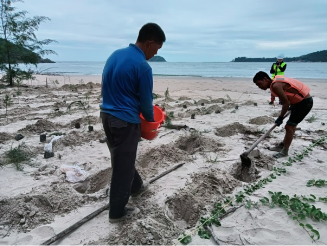 2022年5月18日,沙滩整治修复工作以防风固沙为主题,在沿沙滩向陆一侧区域进行防护林种植。