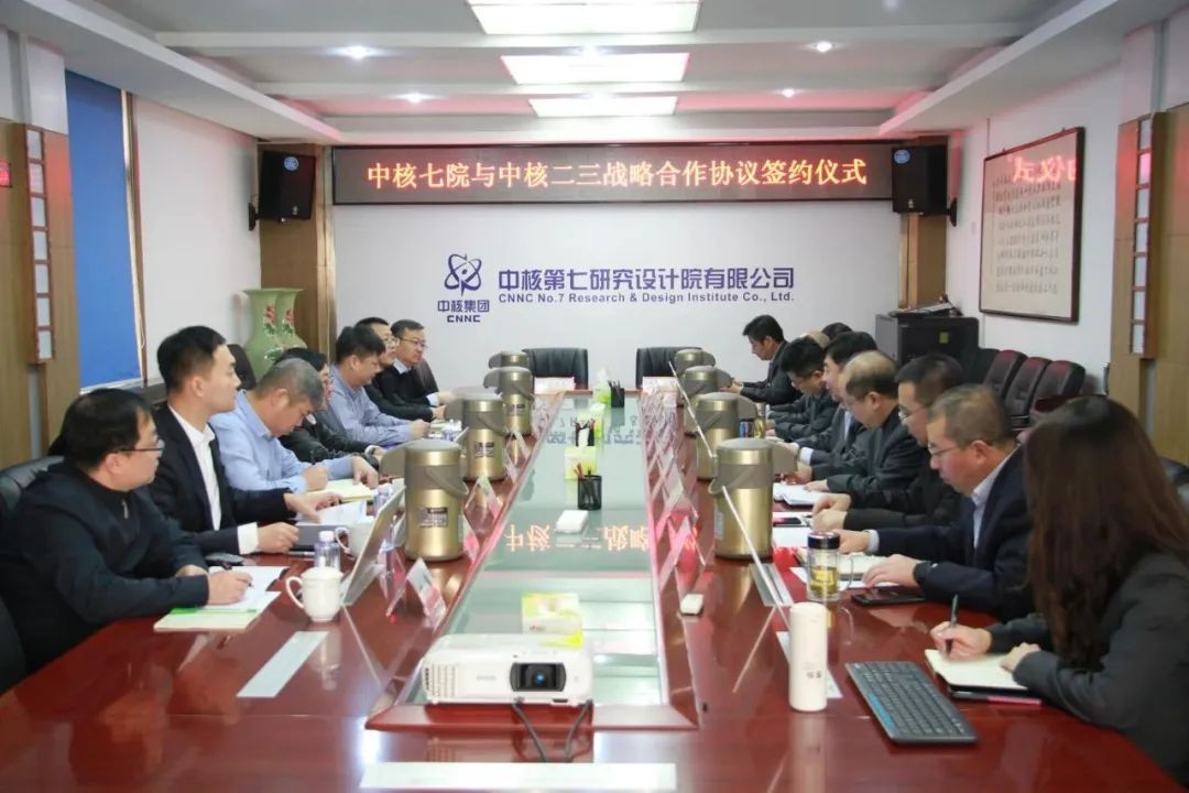 12月8日,中核二三董事长、党委书记李启彬一行拜访中核第七研究设计院有限公司(简称“中核七院”)董事长、党委书记李江颖,双方就进一步深化合作、协同创新、实现共赢发展等方面工作进行了深入交流。交流期间,在李启彬、李江颖的共同见证下,中核七院党委委员、总经理助理李志峰,中核二三副总经济师、系统事业部总经理施发永代表双方签订战略合作协议。