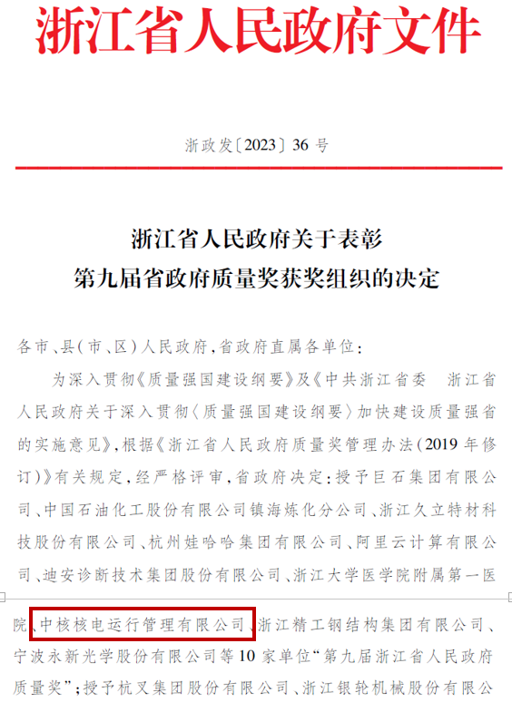 近日,浙江省政府印发《关于表彰第九届省政府质量奖获奖组织的决定》,秦山核电荣获浙江省政府质量奖。