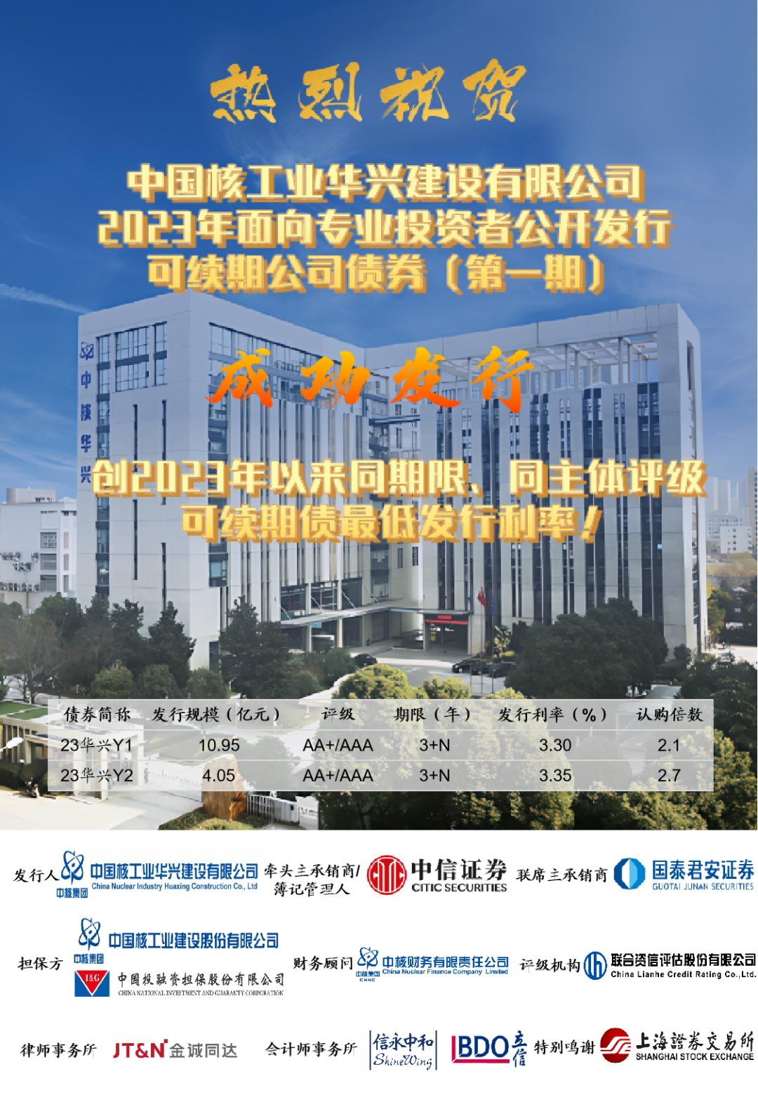 12月7日,中核华兴成功于资本市场首次公开发行15亿元可续期公司债,12月11日全部完成缴款。本期债券获得理财、基金、证券等各类投资人踊跃认购,创2023年以来同期限、同主体评级可续期公司债最低发行利率,充分展现出投资人对中核华兴“建筑业全产业链资源整合者和一体化解决方案服务商”“全球核电建造领跑者”品牌的认可,将进一步拓展公司融资渠道、夯实公司资本实力,助力公司业务结构调整和“十四五”战略目标实现。