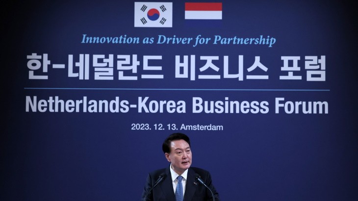尹总统在荷兰-韩国商业论坛上发表讲话(图片来源:总统府)