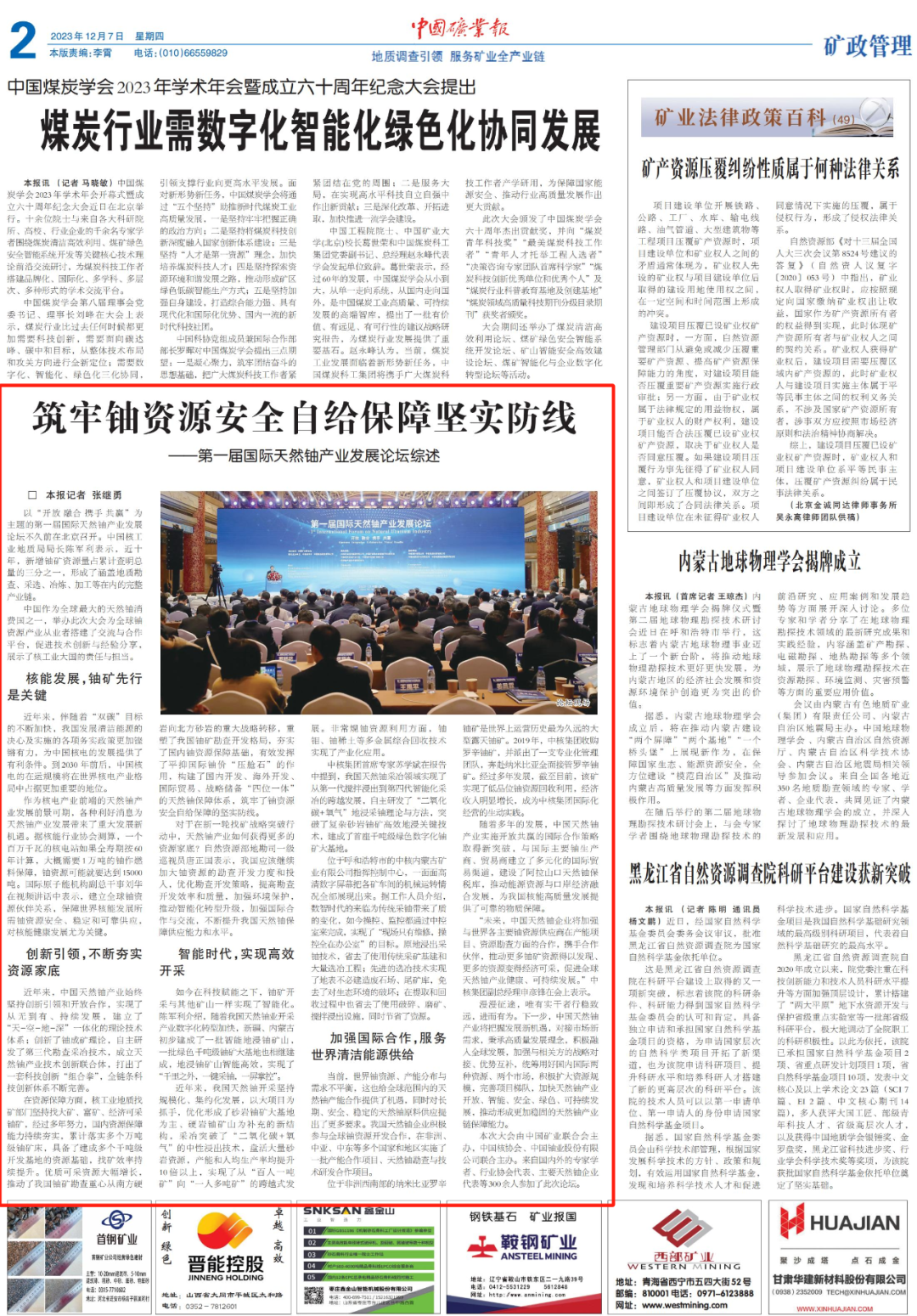 当前,世界铀资源、产能分布与需求不平衡,这也给全球范围内的天然铀产能合作提供了机遇,同时对长期、安全、稳定的天然铀原料供应提出了更多要求。我国天然铀企业积极参与全球铀资源开发合作,在非洲、中亚、中东等多个国家和地区实施了一批产能合作项目、天然铀勘查与技术研发合作项目。位于非洲西南部的纳米比亚罗辛铀矿是世界上运营历史最为久远的大型露天铀矿。2019年,中核集团收购罗辛铀矿,并派出了一支专业化管理团队,奔赴纳米比亚全面接管罗辛铀矿。经过多年发展,截至目前,该矿实现了低品位铀资源回收利用,经济收入明显增长,成为中核集团国际化经营的生动实践。随着多年的发展,中国天然铀产业实施开放共赢的国际合作策略取得新突破,与国际主要铀生产商、贸易商建立了多元化的国际贸易渠道,建设了阿拉山口天然铀保税库,推动能源资源与口岸经济融合发展,为我国核能高质量发展提供了可靠的物质保障。“未来,中国天然铀企业将加强与世界各主要铀资源供应商在产能项目、资源勘查方面的合作,携手合作伙伴,推动更多铀矿资源得以发现、更多的资源变得经济可采,促进全球天然铀产业健康、可持续发展。”中核集团副总经理申彦锋在会上表示。漫漫征途,唯有实干者行稳致远,进而有为。下一步,中国天然铀产业将把握发展新机遇,对接市场新需求,秉承高质量发展理念,积极融入全球发展,加强与相关方的战略对接、优势互补,统筹用好国内国际两种资源、两个市场,积极扩大资源规模,完善项目梯队,加快天然铀产业开放、智能、安全、绿色、可持续发展,推动形成更加稳固的天然铀产业链保障能力。本次大会由中国矿业联合会主办,中国核协会、中国铀业股份有限公司联合主办。来自国内外的专家学者、行业协会代表、主要天然铀企业代表等300余人参加了此次论坛。