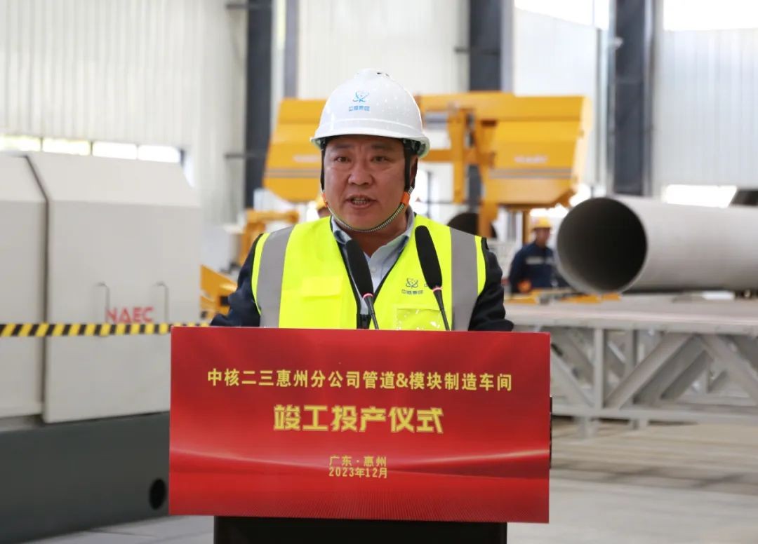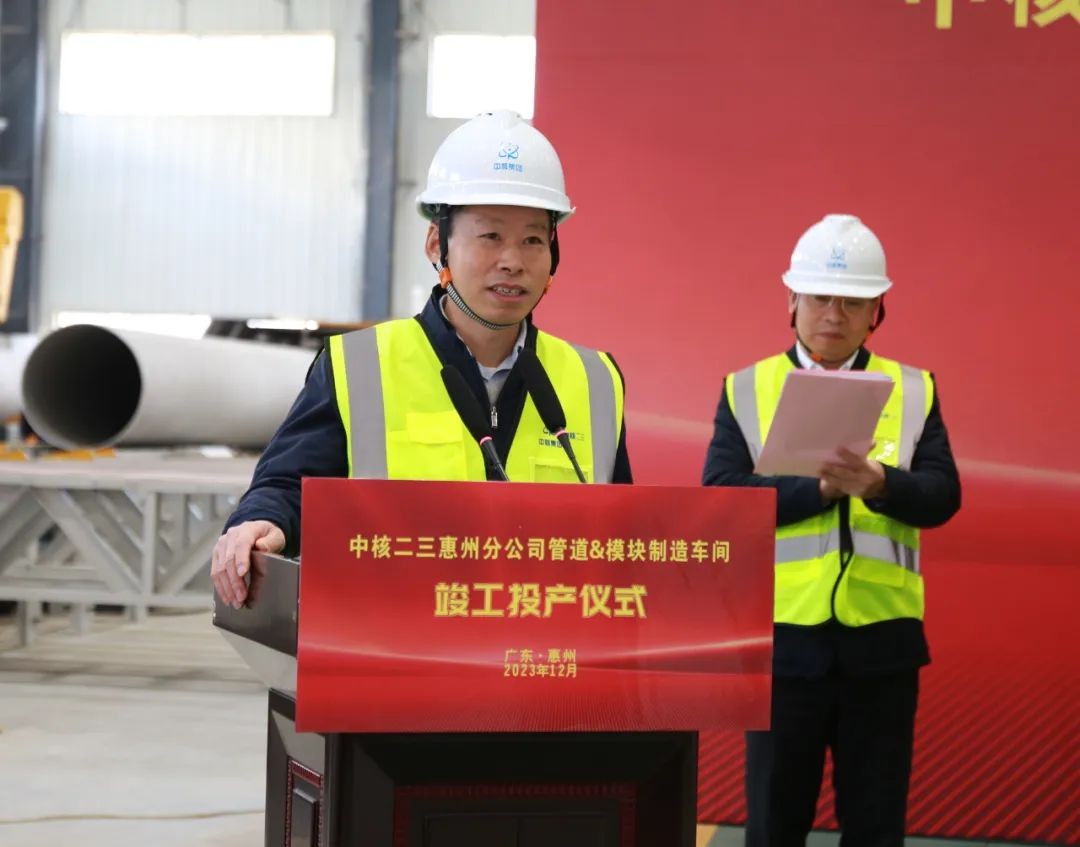 12月25日,中核二三在惠州分公司举行管道及模块制造生产线扩建项目竣工投产仪式。中广核工程有限公司副总经理杨亚璋,施工管理中心主任陈李华受邀参加仪式。公司董事长、党委书记李启彬参加仪式并讲话,董事朱纪、王义,监事会主席陈力得,总经理、党委副书记范凯,党委副书记陆文江,副总经理、总工程师马庆会参加竣工仪式,核能事业部总经理、党委副书记刘海珂主持仪式。