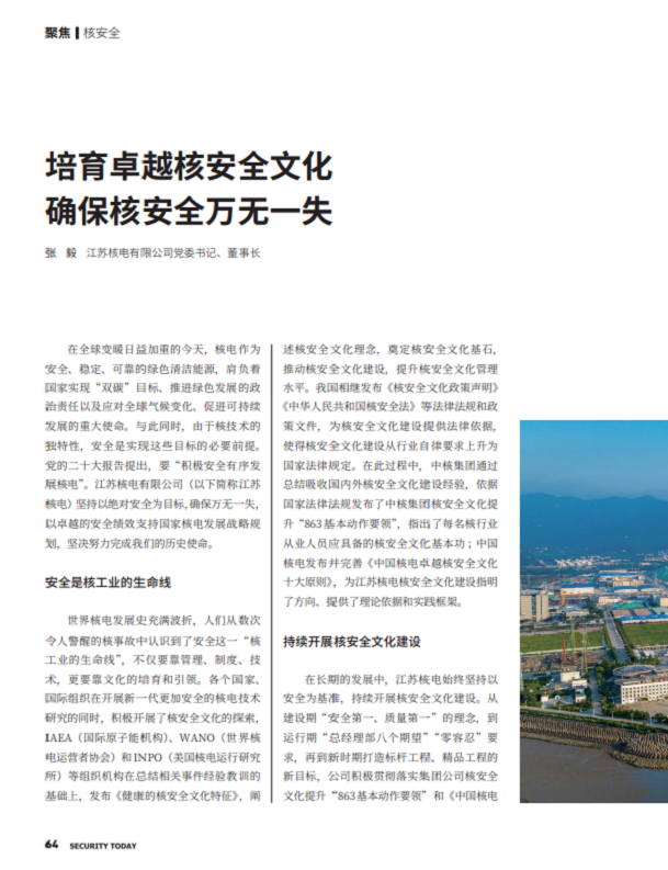 在全球变暖日益加重的今天,核电作为安全、稳定、可靠的绿色清洁能源,肩负着国家实现“双碳”目标、推进绿色发展的政治责任以及应对全球气候变化、促进可持续发展的重大使命。与此同时,由于核技术的独特性,安全是实现这些目标的必要前提。党的二十大报告指出,要“积极安全有序发展核电”,江苏核电有限公司(以下简称江苏核电)坚持以绝对安全为目标,确保万无一失,以卓越的安全绩效支持国家核电发展战略规划,坚决努力完成我们的历史使命。