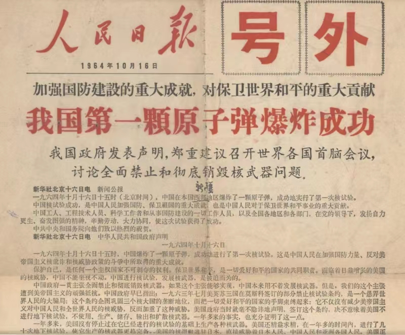 ▲1964年10月16日,《人民日报》以“号外”形式报道我国第一颗原子弹爆炸成功(图片来源:《人民日报》官方微博)