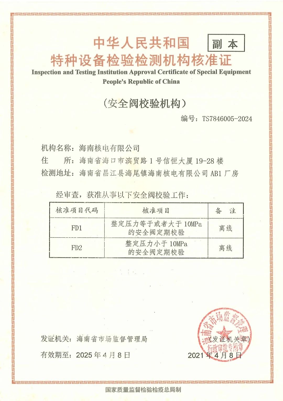 2021年是公司推进“以核为主、一主多元、协同发展”战略落地开局之年,也是公司对外服务全面起步之年。维修一处充分认识对外服务能力建设和市场开拓的重要性,同步抓安全生产,以服务促管理提升,深入推进开源节流、降本增效工作,坚持“走出去”发展战略,积极谋划安全阀校验对外服务工作。在公司领导的高度重视、周密部署及相关处室的全力支持下,海南核电于2021年4月12日正式获得由海南省市场监督管理局颁发的《中华人民共和国特种设备检验检测机构核准证》,成为中国核电成员单位中第一家取得安全阀特种设备检验检测资质的企业。