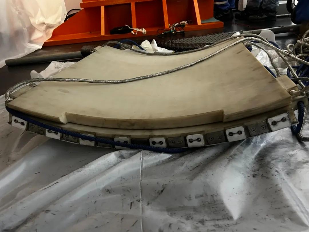 传统发电机抽穿转子整个过程都需要经过双行车起吊、行车与卷扬机牵引、降落转子挂尼龙吊带、行车配合进行移动抽出与穿入等复杂动作。华龙一号机组发电机定子与转子之间间隙极小,本次大修,发电机检修项目组全程采用单行车,并配合自主研制的新型滑块。该技术是对传统工艺的突破与创新,优化了整个发电机抽穿转子的工期,同时避免了传统双行车配合消耗的时间。项目组自主创新研制的新型滑块采用双层结构,包括下层滑块和上层滑块。使用过程中,单层滑块依次通过发电机定转子间隙,对定转子间隙要求更低。上下层滑块通过凹槽和凸部配合,从根本上消除了滑块错位的风险,避免了转子对定子绕组剐蹭的风险。该新型滑块突破了传统形式,使通过单行车抽转子成为现实,解决了检修问题,强化了安全生产,创优了维修工期,加强了成本控制。
