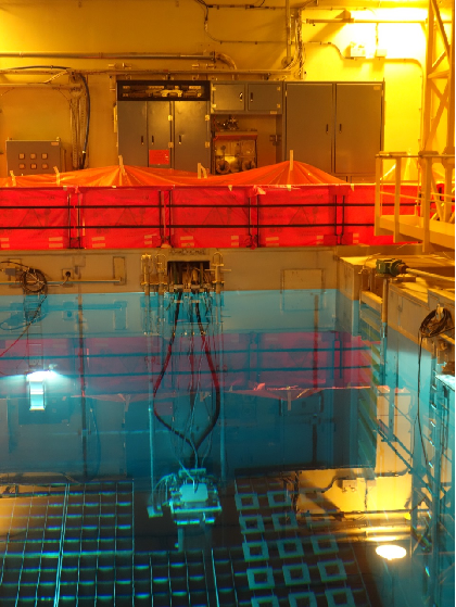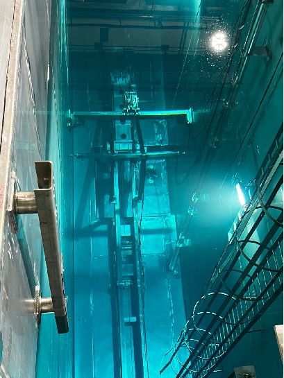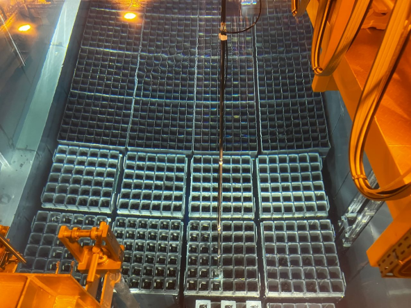 乏燃料桥吊简称乏吊,它可是个“大忙人”,新燃料接收时需要它将升降机中的新燃料吊到乏池格架内,装卸料时需要它在乏池和倾翻机中来回转移燃料组件,倒料时需要它在乏池内来回倒换相关组件等等。“特种兵”乏吊能完成这么多种类的工作,当然离不开趁手的兵器了,它的四大杀手锏分别是乏燃料长柄工具、控制棒电动工具、中子源电动工具和阻力塞手动工具。图为乏池内燃料贮存格架,是燃料组件湿式贮存的地方。