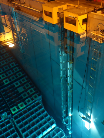 换料机的强项是将燃料组件装入和卸出堆芯,其具备准确定位、边界保护、互锁保护、重量保护、速度保护等安全功能,是我众多“将士”中结构最复杂、功能最强大的一位。通过将装卸料程序导入到PLC中,他可以精准完成燃料组件在堆芯和构件池处倾翻机之间的转移。