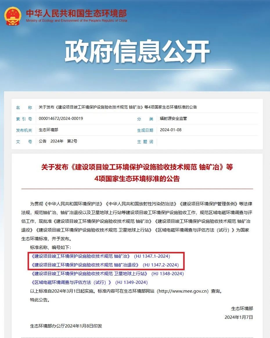 近日,由中辐院主持编制的《建设项目竣工环境保护设施验收技术规范 铀矿冶》(HJ 1347.1-2024)和参与编制的《建设项目竣工环境保护设施验收技术规范 铀矿冶退役》(HJ 1347.2-2024)2项国家生态环境标准正式发布实施,将进一步推动铀矿冶建设和退役项目竣工环保设施验收工作的规范化,对环境管理标准体系的完善具有重要意义。