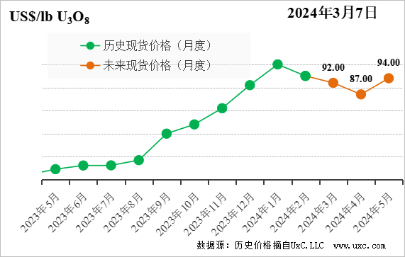 2月份现货价格呈现震荡下行的态势。2月初,哈原工声明2024年产量与2023年基本一致,不提产,现货价格应声快速上涨;一周后,卡梅科表示2024年增产目标不变,加拿大雪茄湖和麦克阿瑟河产量将达到历史最高水平,均为6900吨铀/年,同时声称计划未来将麦克阿瑟河产量提升至产能水平,现货价格快速震荡,但基本保持在100美元/磅以上。此后市场交易遇冷,交易量减少,在买卖双方僵持一周后,卖家频繁调低报价以吸引成交,现货价格快速下跌至95美元/磅并保持至月底。