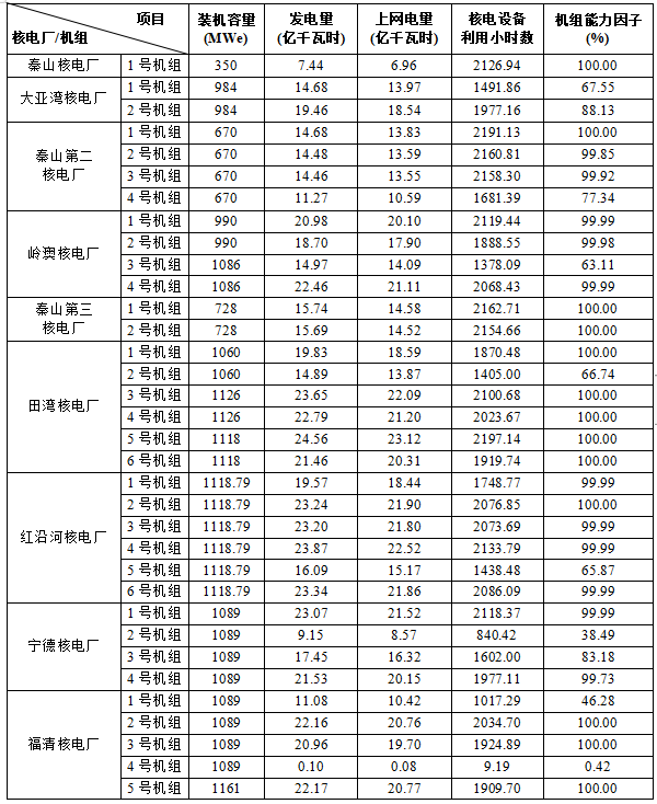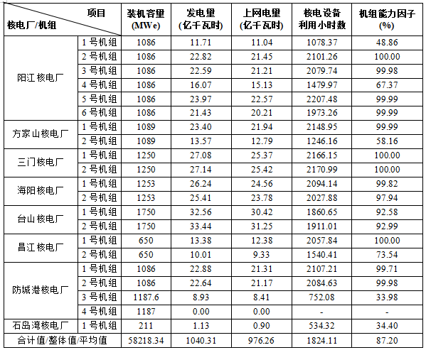 2)本表“合计值/整体值/平均值”中,装机容量、发电量、上网电量为各机组合计值,核电设备利用小时数为全部机组整体值,机组能力因子为全部参与统计机组的算数平均值。