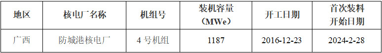 1)防城港核电厂4号机组2024年2月28日装料,暂无本季度调试期间发电量、上网电量数据。