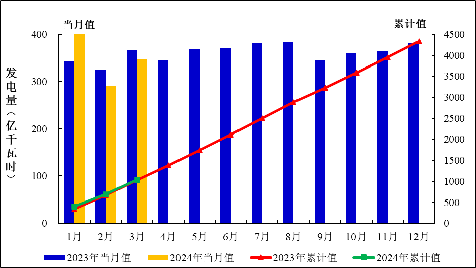 图2:2023年1月至2024年3月全国运行核电机组发电量趋势