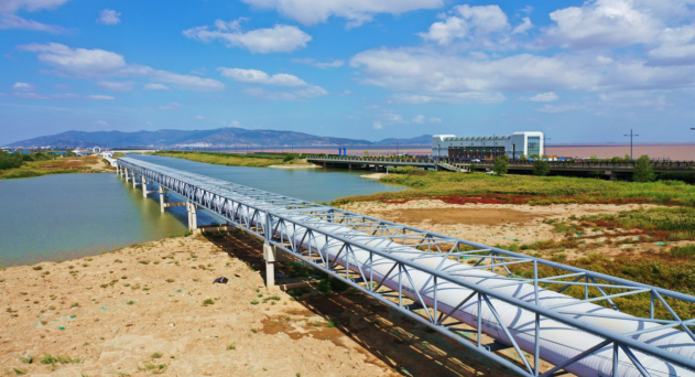 连云港石化产业基地绿色供能工程位于江苏省连云港市,主要建设田湾核电站至连云港石化产业基地长约19.46千米的蒸汽管道,单根蒸汽管道设计输送蒸汽规模为300吨/小时。该项目跨越1处海域、9条河流、22条道路,共架设跨越桁架长度约2560米。项目建成后,每年可减少燃用标准煤40万吨,相应减排二氧化硫184吨、氮氧化物263吨、二氧化碳107万吨。