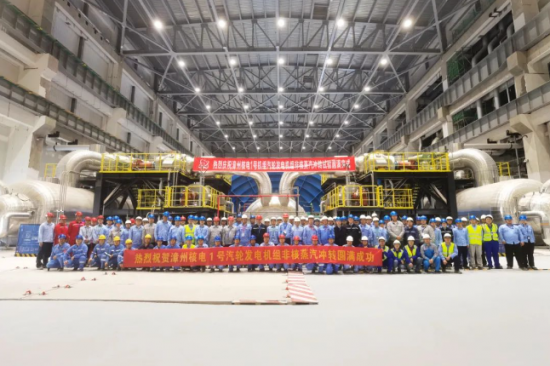 经过数日数夜的不懈努力,16日凌晨,在上海电气保驾团队、漳州业主、中核现场项目部以及安装公司的共同见证下,汽轮机组在390转速平台暖机停留后,一举冲至1500转,圆满完成了此次非核冲转试验,得到了客户的高度赞扬,也为后续汽轮发电机组整体启动及核蒸汽冲转、首次并网及商运奠定了坚实的基础。