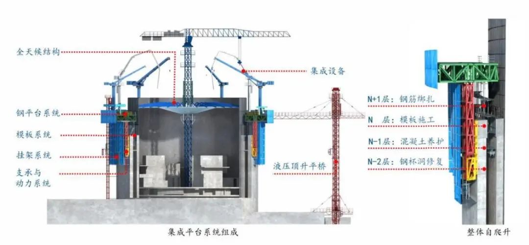 核岛施工平台是基于超高层住宅建筑的“住宅造楼机”和摩天大楼的“空中造楼机”技术而研发的核电反应堆厂房专属施工技术。该技术通过内外壳等高同步施工立面流水作业设备设施集成等方式提升施工工效缩短施工周期、降低安全风险。同时它还具有整体自爬升、多层作业面服务全阶段、设备设施集成、安全监控保障等显著特征。