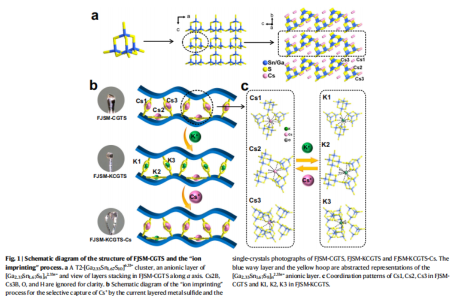 这项研究提出了“无机离子印迹吸附剂”的合成策略,通过精确的结构设计,制备出一种对放射性Cs-137离子具有识别和分离能力的金属硫化物(FJSM-CGTS)。新材料对Cs-137离子吸附具备容量高(246.65mg/g)、速度快(5分钟内达到平衡)、特异性强(高盐、酸性去除率达到99%)、减容率高等优势。该“离子印迹吸附剂”选择性去除Cs-137的能力超过了大多数已报道的无机固体吸附材料。
