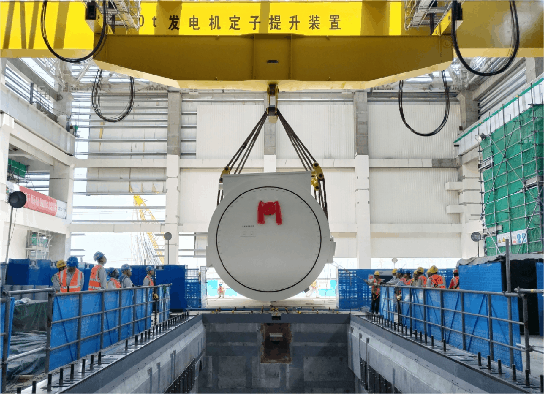 上海核工院推行清单化管理办法,完成了吊装方案优化、磁屏蔽安装、基础埋件处理等大量工作。值得注意的是,定子就位需主厂房行车轨道上安装1台470吨定子液压提升装置,公司践行“向技术要一切”的工作理念,创新性地提出了采用800吨履带吊单机吊装、巧借凝汽器抬吊梁横跨钢屋架、水平旋转箱型梁体就位于轨道的方案,降低安全风险的同时进一步提升了施工工效。