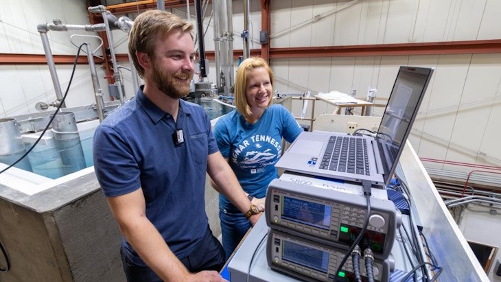 凯尔·里德 (Kyle Reed) 和黛安·埃泽尔 (Dianne Ezell) 在反应堆池中测试传感器晶体管时收集数据