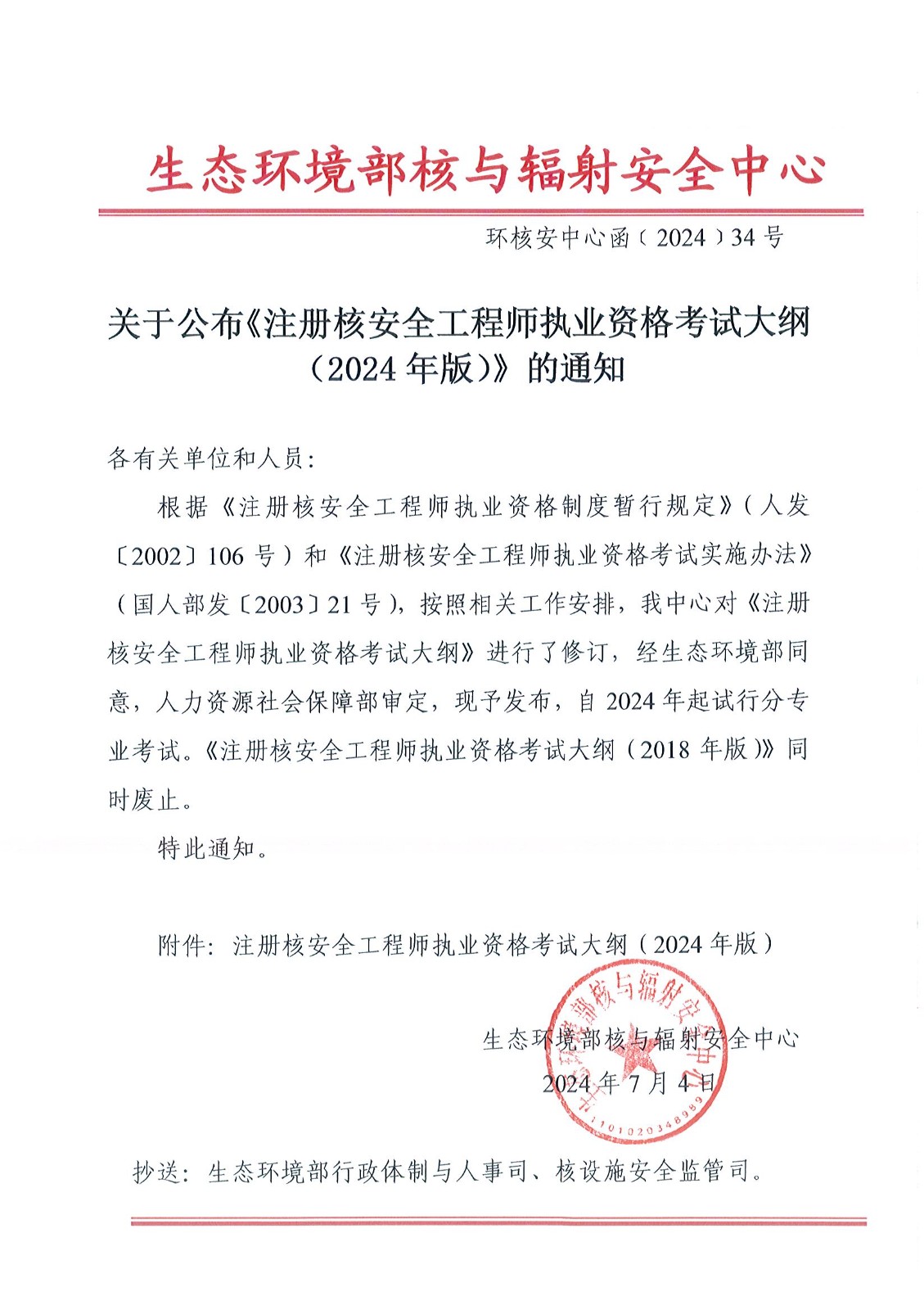 根据《注册核安全工程师执业资格制度暂行规定》(人发〔2002〕106号)和《人力资源社会保障部办公厅关于2024年度专业技术人员职业资格考试工作计划及有关事项的通知》(人社厅发〔2024〕1号)有关规定,现将2024年注册核安全工程师执业资格全国统一考试相关工作安排通知如下。