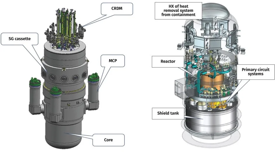 RITM-200N核电站的整体设计设想在单个容器内使用堆芯和蒸汽发生器(SG)。如下图(右)所示,反应堆冷却剂泵(RCP)直接焊接在反应堆压力容器(RPV)上,不包括反应堆冷却剂系统(RCS)中的任何管道。