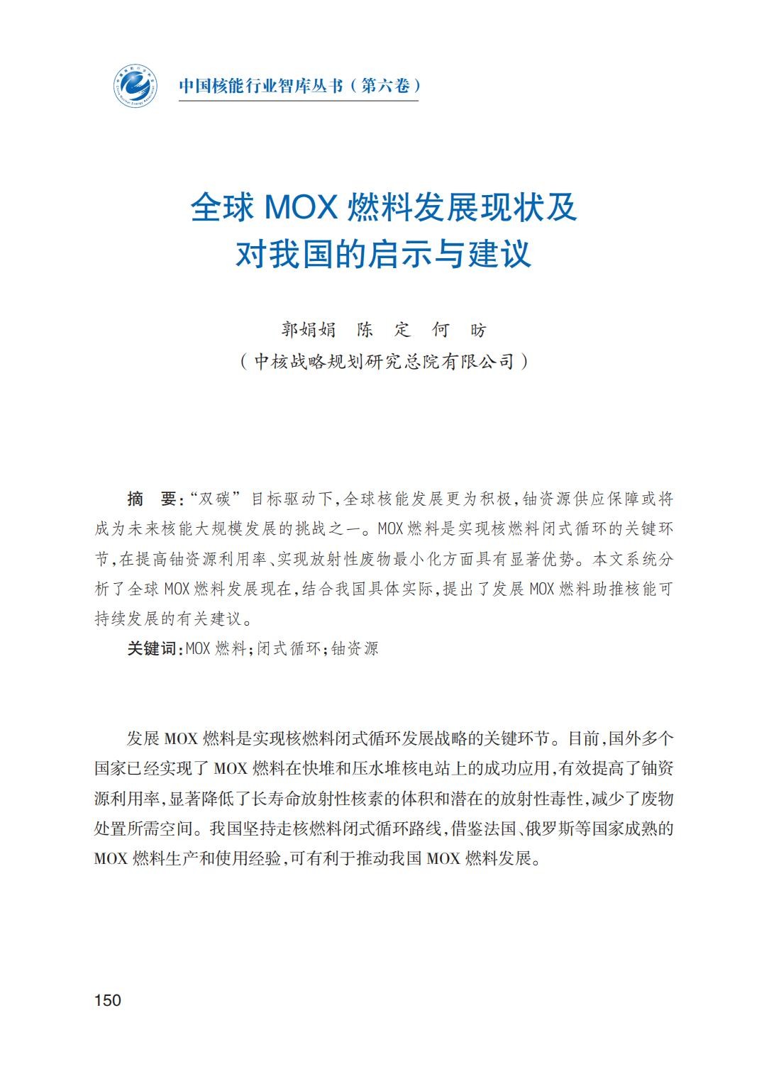 MOX 燃料是实现核燃料闭式循环的关键环节,在提高铀资源利用率、实现放射性废物最小化方面具有显著优势。本文系统分析了析了全球 MOX燃料发展现在,结合我国具体实际,提出了发展 MOX燃料助推核能可持续发展的有关建议。