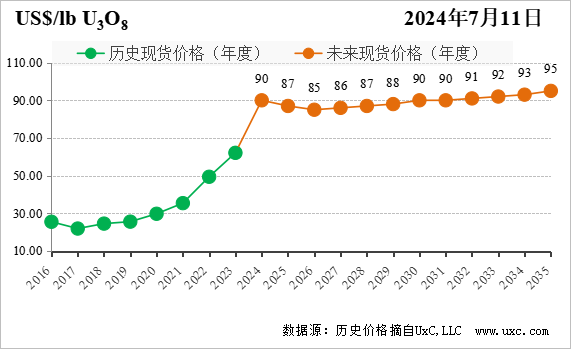 6月份现货价格呈现下跌态势。进入6月,市场持续降温,现货交易冷清,卖方不断下调报价吸引成交,现货价格由6月3日的89.75美元/磅持续下跌至6月11日的83.00美元/磅,后受到尼日尔撤销欧安诺伊姆铀矿运营许可等事件影响,引起市场对供应端未来恢复不及预期的担忧,现货价格小幅震荡后回升,于月底收于85.50美元/磅。