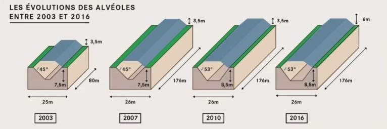 获得批准后,Cires 将能够容纳总计 950,000 立方米的 TFA,而不是最初批准的 650,000 立方米。通过对处置单元进行各种改进,无需增加存储面积即可实现这一目标。处置单元最初长 80 米,可容纳 10,000 立方米的废物。2007 年之后,建造了 176 米长的单元,将单元容量增加到 25,000 立方米。2010 年,斜坡变陡并加深了单元,进一步将单元容量增加到 27,000 立方米。2016 年,储存库地上部分的高度增加,每个单元的存储容量增加到约 30,000 立方米。