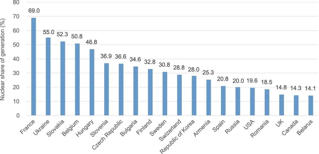 图1 核电占比超过本国电力供给1/5的国家(2021年12月)。