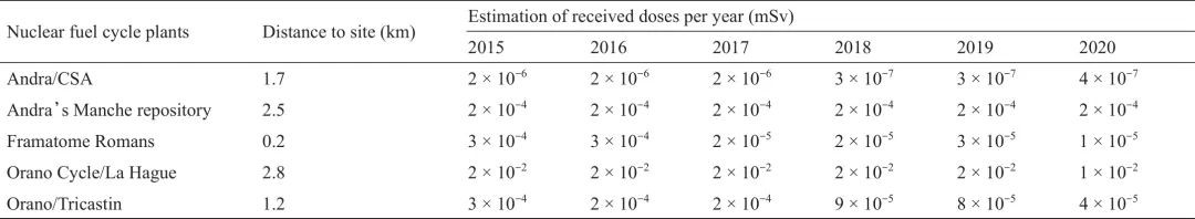 表1显示了正常运行期间法国核燃料循环设施的辐射影响。据估算,辐射剂量仍然很低,比天然辐射照射的年剂量低2~4个数量级。