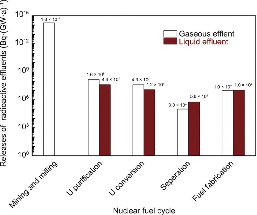 图3 中国核燃料循环放射性流出物的平均排放量(2011—2013)。经许可转载自参考文献。U:铀。