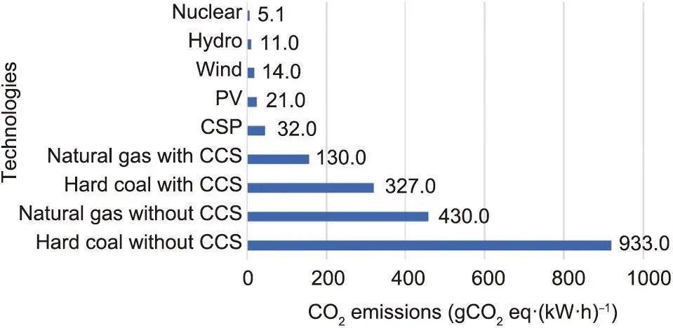 图4 不同发电技术全生命周期CO2当量排放量。按中值递增排列[gCO2eq∙kWh-1,即每千瓦时的CO2当量排放量克数]。经许可转载自参考文献。CCS:碳捕获和封存;CSP:聚光太阳能发电。