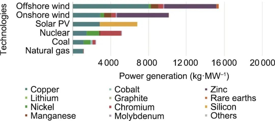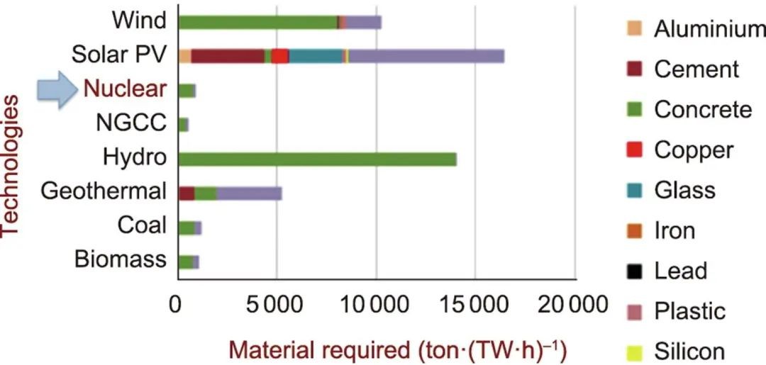 图5 不同发电技术所需的材料量(不包括燃料),以单位装机容量(MW)所需的材料质量表示。经许可转载自参考文献。