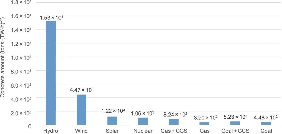 图7 从全生命周期分析中推断的各种发电形式所需混凝土量[t∙(TW·h)-1]。经许可转载自参考文献。