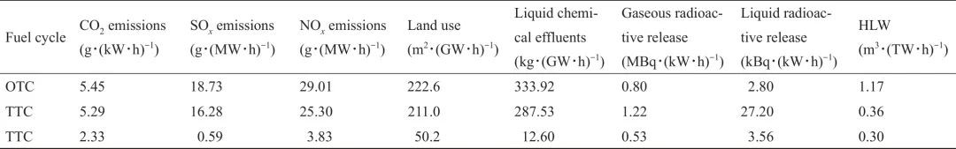 如果采用四代快中子反应堆发电,如钠冷快堆(SFR),由于取消了所有的前端循环操作,废物释放量和生成量将大幅减少。达到平衡状态的SFR可以使用自身产生的乏燃料和额外的贫铀运行,并有可能燃烧次锕系元素。理论上讲,钚和铀的多次回收以及次锕系元素嬗变需要附加的乏燃料后处理步骤,可将HLW危害的持续时间从几十万年缩短至几百年。在法国,已经通过千克单位的小规模试点证明了提取次锕系元素的可行性。但只有当四代快中子反应堆趋于成熟后,才可能被扩大到工业规模。研究表明,只有当所有SFR都能嬗变锕系元素时,才有可能发生次锕系元素的嬗变。快中子反应堆基本上可燃烧贫化铀,从而绕过燃料循环的前端(特别是铀矿开采),进一步减少核能系统的环境足迹。根据法国核设施基地的全生命周期分析,表3进行了不同方案的比较。