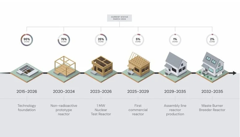 在实现里程碑 #3 之后,里程碑 #4预计会相对简单,尽管在建造五到十个商用反应堆之前可能需要运行多个版本的测试反应堆。目标是到 2028 年拥有商用反应堆,但要等待愿意支持此类先进反应堆的国家的批准。计划在目前的公司总部组装十个商用反应堆。