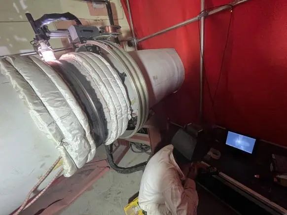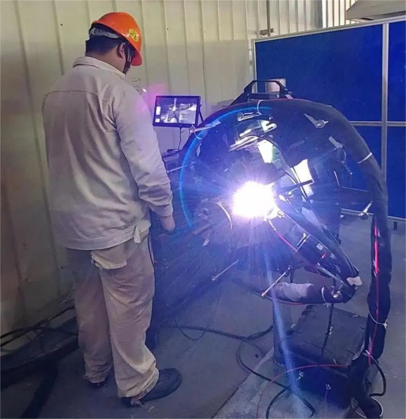 在焊接自动化领域,卡钳式自动焊机虽有较多应用案例,但常规设备因机械设计、结构限制等原因无法集成熔池监控系统,焊接过程中操作工人需要佩戴焊帽等安全防护工具观察熔池状态,未能充分降低焊接工人的劳动强度,且依然存在劳动安全风险,并无法处理焊接过程中的观察盲区,未能完全发挥出自动焊的特点和优势。中核二三自动焊设备研发团队聚焦痛点,大胆尝试,结合核电现场工况,经过大量试验、改进、优化,实现了行业内首次在卡钳式自动焊设备上应用具备高强度耐湿耐热、监控画面全域高清、熔池特征清晰可见的焊接过程实时监控系统,为卡钳式自动焊设备增附一双能识“弧”辨“焊”的“火眼金睛”。