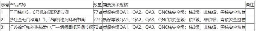 招标项目名称:三门核电5、6号机组、浙江金七门核电厂1、2号机组及江苏徐圩核能供热发电厂一期项目闭环调节阀