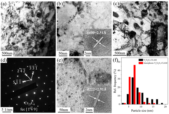 图1 添加氧化物Y2Ti2O7的初始结构:(a-c) 纳米粉末;(d-e) 非晶粉末;(f) XRD图谱