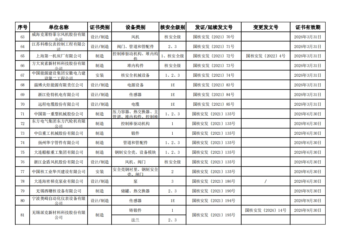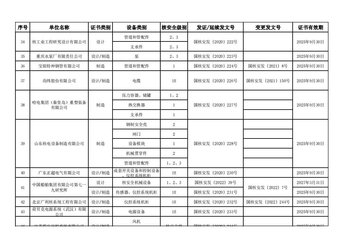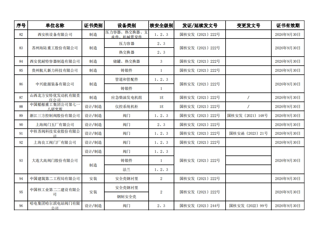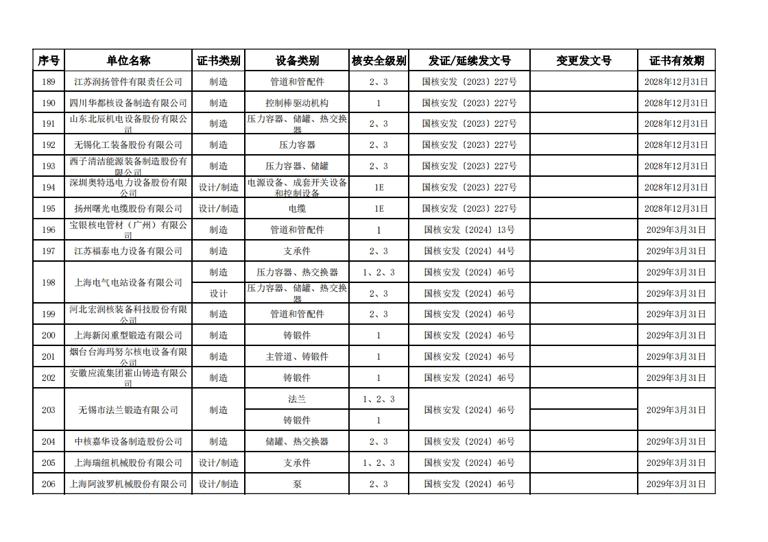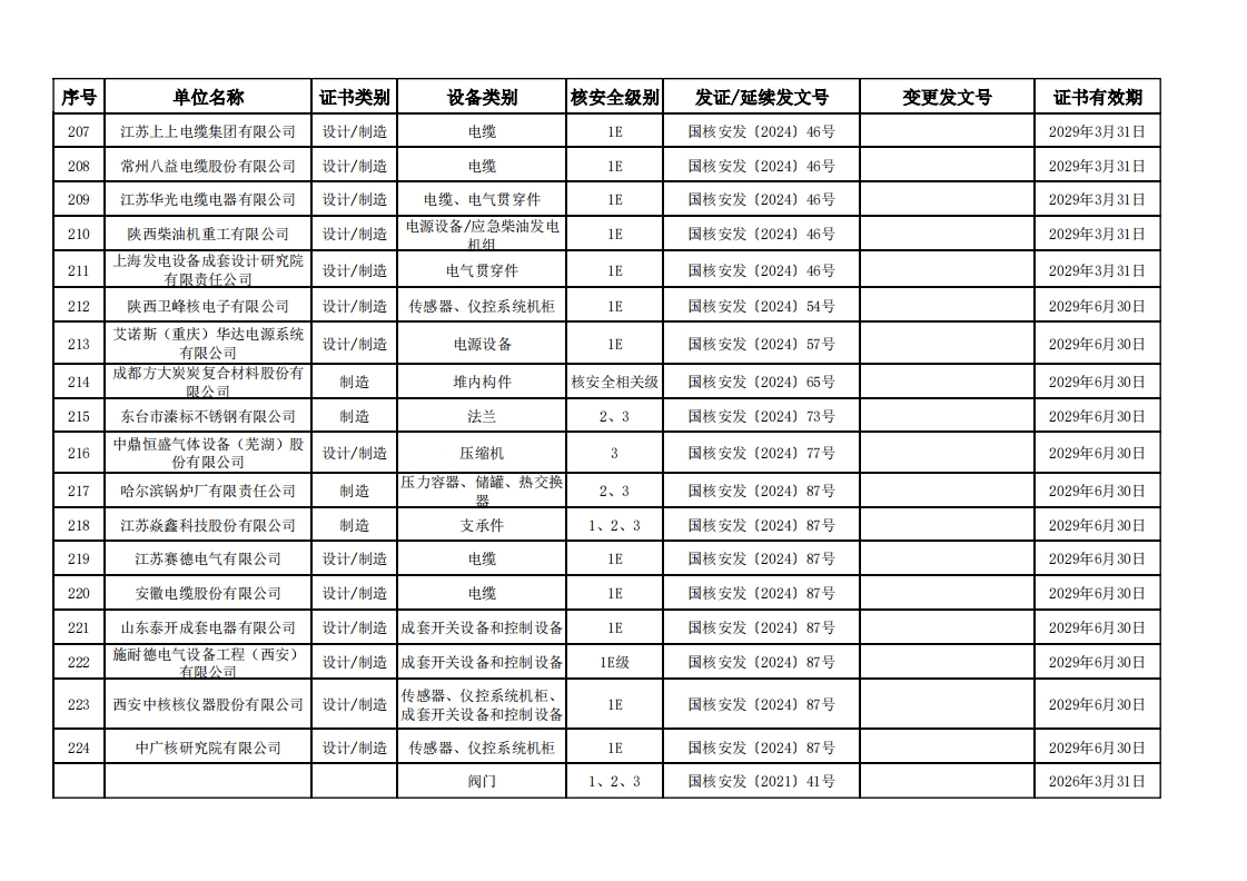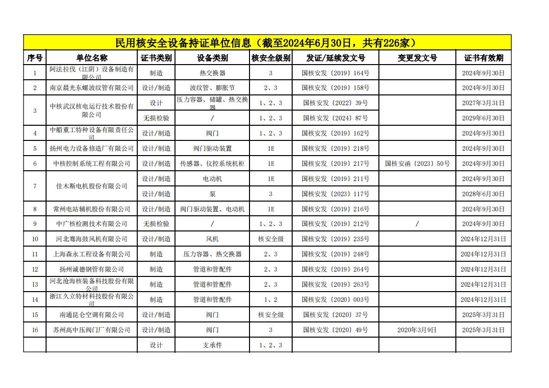 2024年8月1日,国家核安全局发布民用核安全设备持证单位信息统计表,截至2024年6月30日共有226家登记在册。