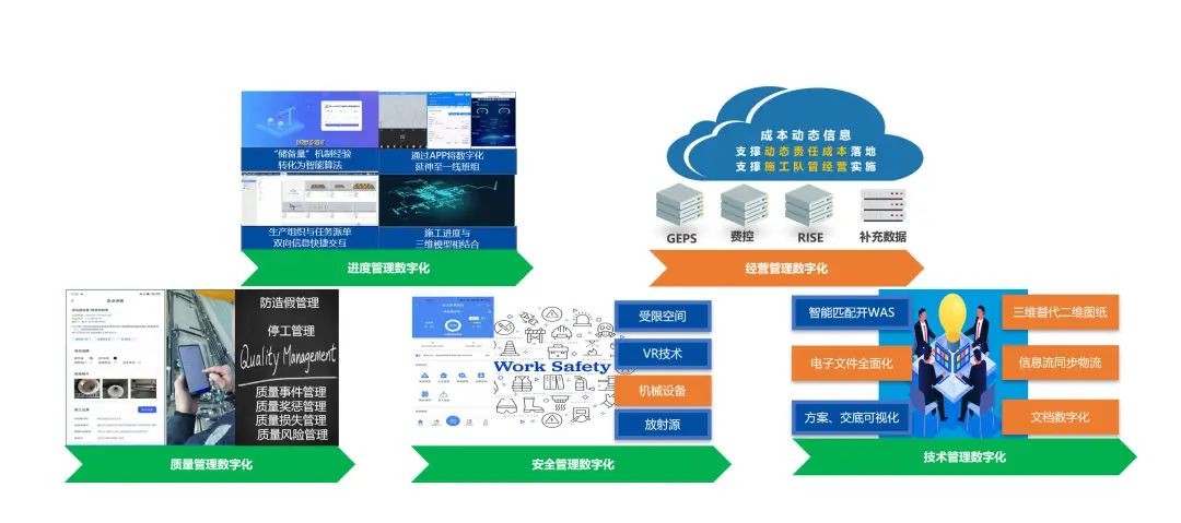 徐大堡项目部以“简化管理、穿透管理”为核心目标,制定《全周期数字化转型推进方案》,以RISE系统、BIM技术应用、智能BI报表、“数字员工”为突破点,从经营管理、进度管理、质量管理、安全管理和技术管理五个方面系统推进项目部数字化转型工作。