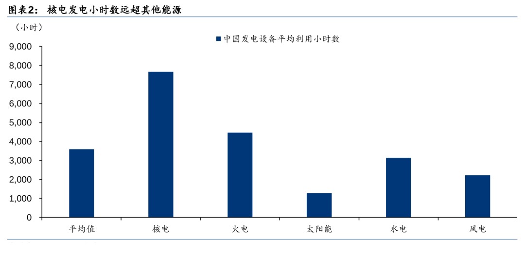 核电能量密度高/发电稳定高效,碳排放量低于风光。核裂变发电站是指利用铀核裂变所释放出的热能进行发电,具备能量密度高、单机功率大、土地利用率高、不受季节和气候影响、发电成本稳定且相对较低等特点,可长期稳定高效运行。相比其他发电方式,核电机组的年发电利用小时数常年保持在7000小时以上,位居所有电源之首,而且在生产过程中不排放二氧化硫、氮氧化物、烟尘和二氧化碳。核电全寿期二氧化碳排放当量仅约12.2克/千瓦时,与水电基本持平,低于风电、光伏。安全是核电产业发展的前提,现有的三代核电主要在安全系统改进上提升了核电站的安全性。