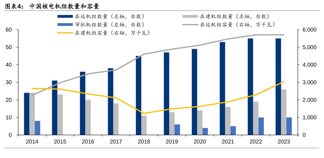 核电发电稳定/碳排放低,安全为发展前提,常态化审批渐进。核电站发电原理是利用铀核裂变所释放出的热能驱动汽轮机做功,具备能量密度高、功率大、发电稳定且成本低的特点,其年平均发电小时数是中国发电设备发电小时数平均值的2倍。安全是核电行业发展的前提,自日本福岛核事故以来,我国核电审批一度停滞,2016-2018连续3年没有新增审批核电机组。直到2019年中国重启核电审批,随后三年每年核准机组数量稳定在4-5台,“十四五”规划中明确提出安全稳妥推动沿海核电建设。2022年和2023年我国均核准10台,较2021年数量翻倍,审批显著提速,常态化审批渐行渐近。