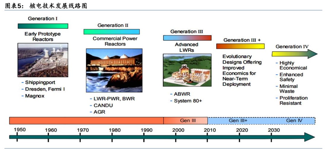 裂变核电技术已发展到第四代,安全/可持续性/经济性不断提高:(1)第一代核电技术:1950s-1960s期间,美苏英法等国建造一代堆,主要是试验性和原型反应堆;(2)第二代核电技术:1960s末期,和第一代反应堆相比,装机容量不断增加,主要堆型有压水堆、沸水堆、重水堆等;(3)第三代核电技术:主要是先进轻水堆,包括先进压水堆和先进沸水堆,其特点是采用非能动安全系统或先进的能动安全系统以提高安全性;(4)第四代核电技术:由“第四代核能系统国际论坛”(GIF)提出的能够解决核能经济性、安全性、废物处理和防核扩散问题的第四代核电核能系统,包括钠冷快堆、高温气冷堆、气冷快堆、铅冷快堆、超临界水堆和熔盐堆。