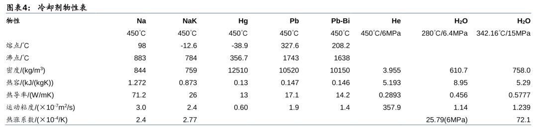 第四代核电技术目标是解决核能经济性、安全性、废物处理和防核扩散问题,提出了6种最有发展潜力的堆型,包括钠冷快堆、铅冷快堆、气冷快堆3种快中子堆以及超临界水冷堆、高温气冷堆、熔盐堆3种热中子堆。其中快中子堆能够有效利用铀资源,解决核燃料短缺问题,并且嬗变长寿命放射性废物,解决长寿命核废物的处置问题。第四代核电具有较高的安全性,钠冷快堆和铅冷快堆使用金属冷却剂,导热性能好,能将热量快速导出,气冷快堆、高温气冷堆和超临界水堆采用单相冷却剂,不会发生相变,导热稳定;熔盐堆采用液态燃料,不存在堆芯熔毁风险。