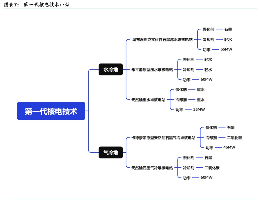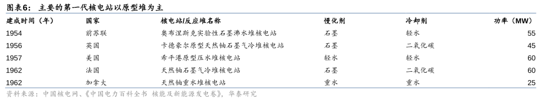 第一代核电以原型堆为主,主要用于验证核电设计技术和商业开发前景。1954年6月27日,前苏联建成的世界上第一座核能发电站——5MW奥布涅斯克实验性石墨沸水堆核电站。随后各国纷纷开始研究核电技术,建立了一系列的核电站,包括1956年英国45MW卡德豪尔原型天然铀石墨气冷堆核电站、1957年美国60MW希平港原型压水堆核电站、1962年法国60MW天然铀石墨气冷堆核电站、1962年加拿大25MW天然铀重水堆核电站。第一代核电站的投资费用高、功率普遍较小,建造的主要目的是为了通过试验示范来验证核电的工程实施可行性。