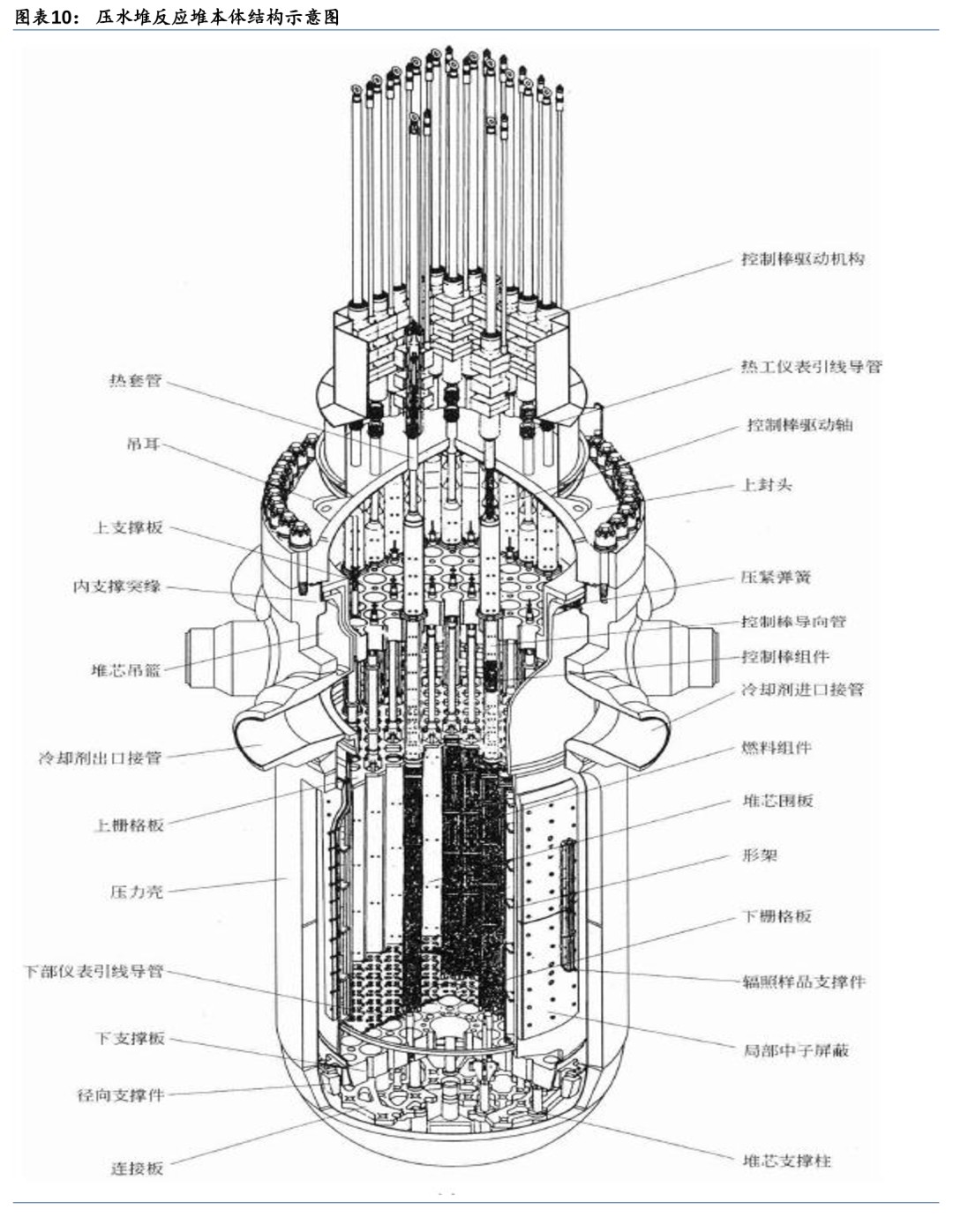 1) 反应堆本体结构:由堆芯、堆芯支撑结构、反应堆压力容器及控制棒传动机构组成。①堆芯结构:包括燃料组件和堆芯功能组件(控制棒组件、可燃毒物组件、阻力塞组件、初次中子源棒组件、次级中子源棒组件);②堆芯支撑结构:为堆芯组件提供支撑、定位和导向,组织冷却剂流通,以及为堆内仪表提供导向和支撑,包括下部支撑结构、上部支撑结构和堆芯仪表支撑结构;③反应堆压力容器:支撑和包容堆芯和堆内构件,防止放射性物质外溢;④控制棒驱动机构:带动控制棒组件在堆芯内上下运动,实现反应堆的启动、功率调节、停堆和事故情况下的安全控制。
