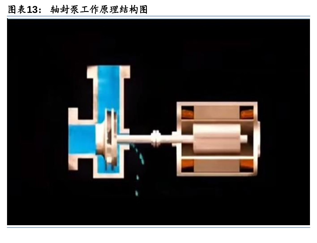 3) 反应堆冷却剂泵(驱动冷却剂循环):又称主循环泵,在正常情况下,冷却剂泵的功能是为反应堆堆芯提供足够的冷却流量并保证反应堆冷却剂的循环;在事故工况下,依靠冷却泵机组的惯性惰转,带出堆芯余热,保证反应堆的安全。水冷堆主泵按结构可分为屏蔽泵和轴封泵,屏蔽泵按结构又可分为屏蔽套泵和湿定子泵。屏蔽套泵的定、转子分别通过屏蔽套来实现与冷却剂的隔离,因此可确保冷却剂实现零泄露;湿定子泵没有阻止水进入定子绕组的隔套,流体直接流过定子绕组带走热量,内部磁损较小,效率比屏蔽套泵高;轴封泵在泵轴和电机轴之间装有复杂的轴密封结构,由于减少了定、转子屏蔽套的涡流损失,因此效率更高。现代压水堆核电厂广泛使用的是轴封泵。